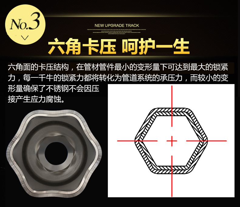 卡壓式連接~分單卡壓跟雙卡壓兩種,由德國率先垂范搭配使用的卡壓式管件,連接強度高,抗震動,滿足嵌入式安裝的要求,極大地減少了隱蔽環(huán)境中水管漏水的可能性,滿足了國家CECS153:2003標(biāo)準(zhǔn),適合DN15-DN100口徑管道使用,避免明火焊接操作。
