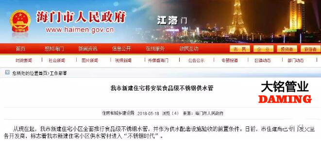不銹鋼水管行業(yè)再傳利好,海門市日前專門發(fā)文至各開發(fā)商:新建住宅小區(qū)全面推行食品級不銹鋼水管,并作為供水配套設(shè)施驗收的前置條件。這也是國內(nèi)首個對新建住宅推行不銹鋼水管的城市。